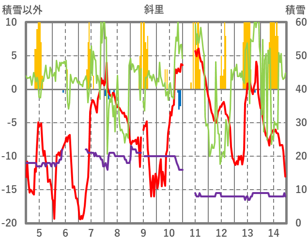 | 日 | 時 | 気温 | 降水 | 風向/風速 | 日照 | 積雪 | 降雪 |