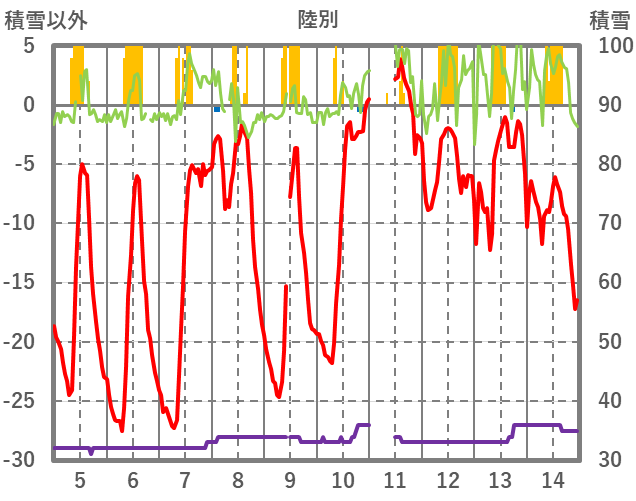 | 日 | 時 | 気温 | 降水 | 風向/風速 | 日照 | 積雪 | 降雪 |