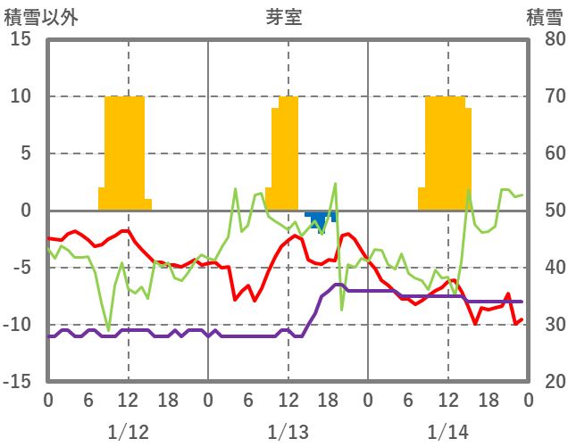 | 日 | 時 | 気温 | 降水 | 風向/風速 | 日照 | 積雪 | 降雪 |