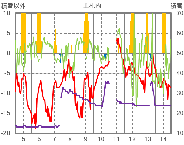 | 日 | 時 | 気温 | 降水 | 風向/風速 | 日照 | 積雪 | 降雪 |