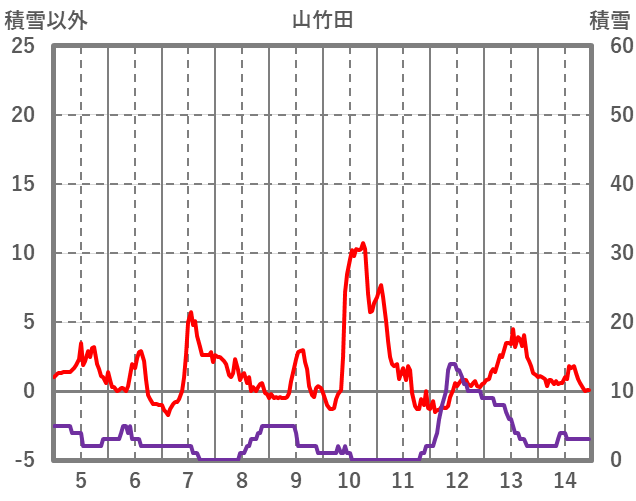 | 日 | 時 | 気温 | 降水 | 風向/風速 | 日照 | 積雪 | 降雪 |