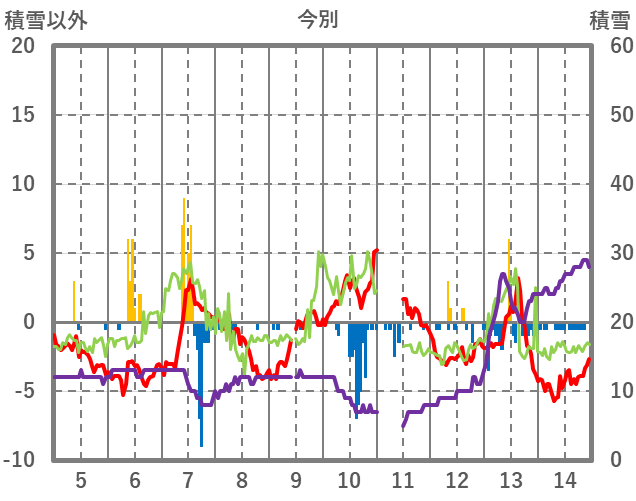 | 日 | 時 | 気温 | 降水 | 風向/風速 | 日照 | 積雪 | 降雪 |
