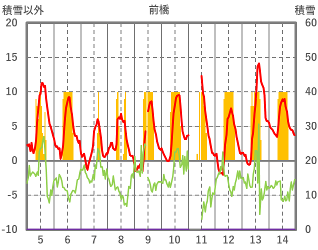 | 日 | 時 | 気温 | 降水 | 風向/風速 | 日照 | 積雪 | 降雪 |