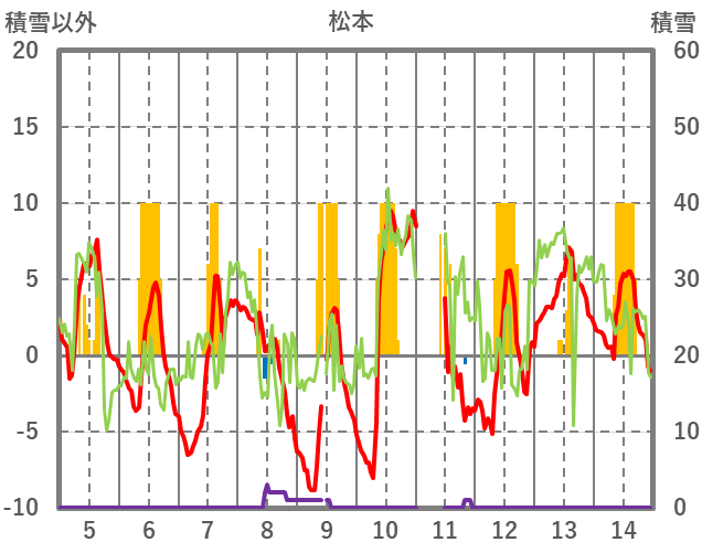 | 日 | 時 | 気温 | 降水 | 風向/風速 | 日照 | 積雪 | 降雪 |