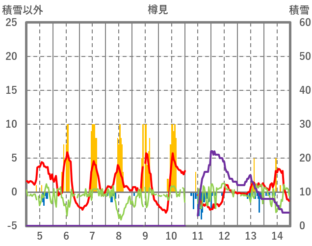 | 日 | 時 | 気温 | 降水 | 風向/風速 | 日照 | 積雪 | 降雪 |
