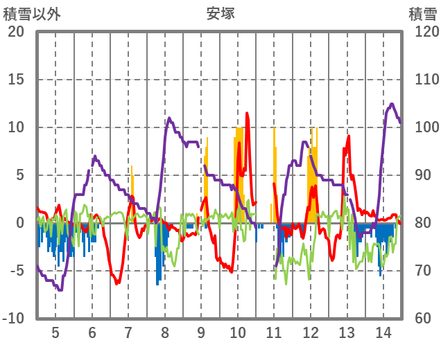 | 日 | 時 | 気温 | 降水 | 風向/風速 | 日照 | 積雪 | 降雪 |