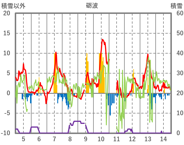 | 日 | 時 | 気温 | 降水 | 風向/風速 | 日照 | 積雪 | 降雪 |
