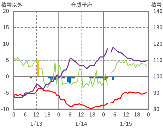 | 日 | 時 | 気温 | 降水 | 風向/風速 | 日照 | 積雪 | 降雪 |