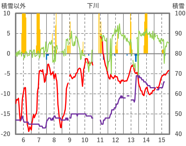 | 日 | 時 | 気温 | 降水 | 風向/風速 | 日照 | 積雪 | 降雪 |
