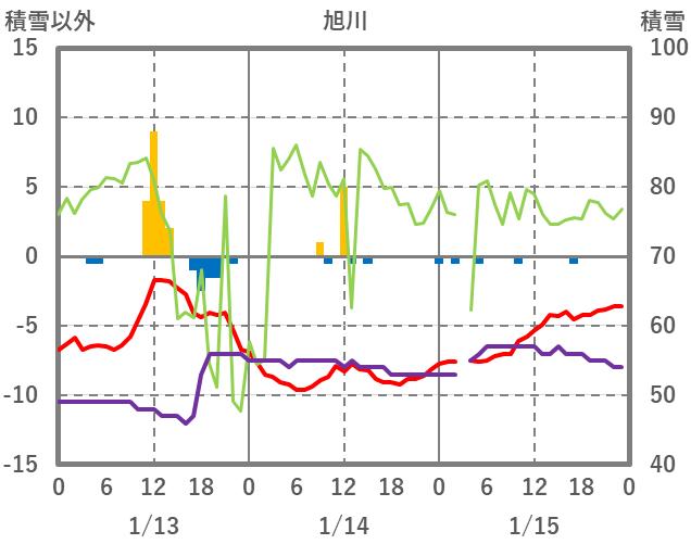 | 日 | 時 | 気温 | 降水 | 風向/風速 | 日照 | 積雪 | 降雪 |