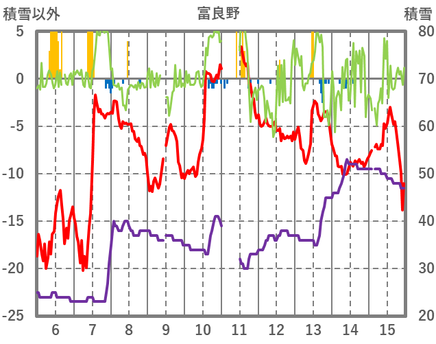 | 日 | 時 | 気温 | 降水 | 風向/風速 | 日照 | 積雪 | 降雪 |