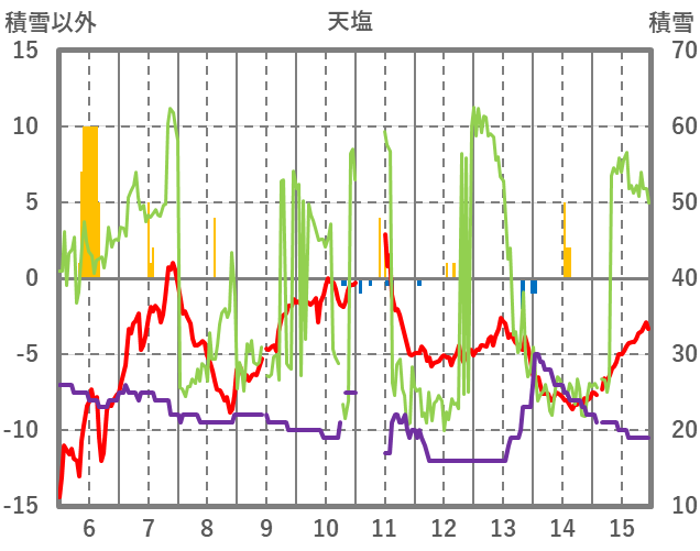 | 日 | 時 | 気温 | 降水 | 風向/風速 | 日照 | 積雪 | 降雪 |