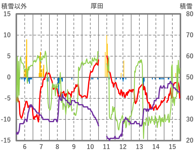 | 日 | 時 | 気温 | 降水 | 風向/風速 | 日照 | 積雪 | 降雪 |