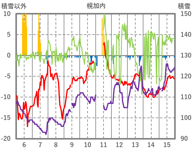 | 日 | 時 | 気温 | 降水 | 風向/風速 | 日照 | 積雪 | 降雪 |
