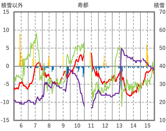 | 日 | 時 | 気温 | 降水 | 風向/風速 | 日照 | 積雪 | 降雪 |