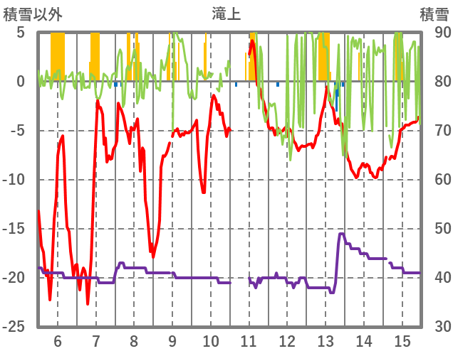 | 日 | 時 | 気温 | 降水 | 風向/風速 | 日照 | 積雪 | 降雪 |