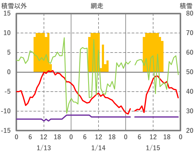 | 日 | 時 | 気温 | 降水 | 風向/風速 | 日照 | 積雪 | 降雪 |