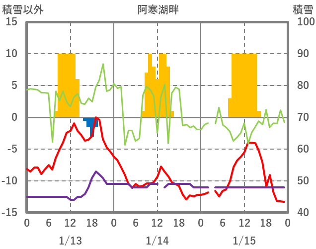 | 日 | 時 | 気温 | 降水 | 風向/風速 | 日照 | 積雪 | 降雪 |