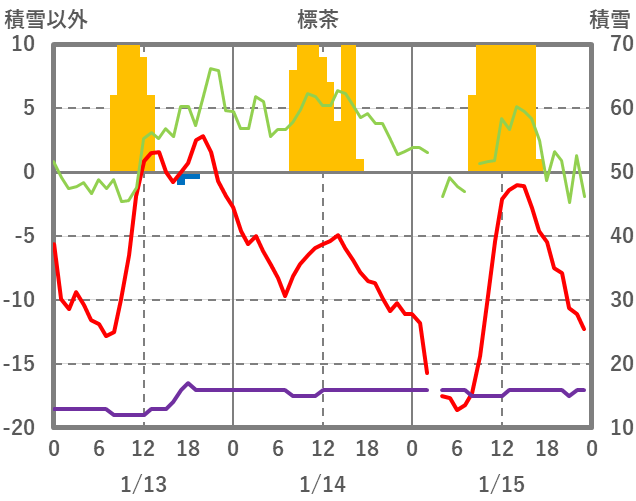 | 日 | 時 | 気温 | 降水 | 風向/風速 | 日照 | 積雪 | 降雪 |