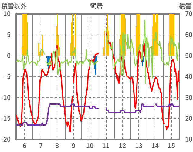 | 日 | 時 | 気温 | 降水 | 風向/風速 | 日照 | 積雪 | 降雪 |