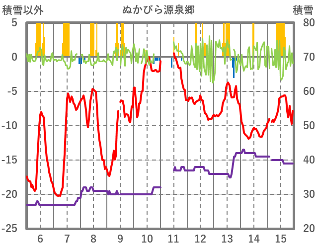 | 日 | 時 | 気温 | 降水 | 風向/風速 | 日照 | 積雪 | 降雪 |