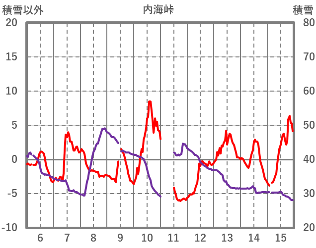 | 日 | 時 | 気温 | 降水 | 風向/風速 | 日照 | 積雪 | 降雪 |