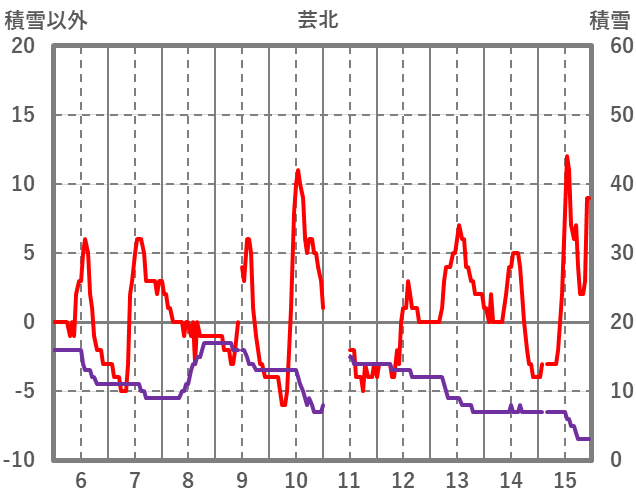 | 日 | 時 | 気温 | 降水 | 風向/風速 | 日照 | 積雪 | 降雪 |