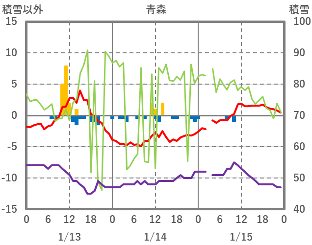 | 日 | 時 | 気温 | 降水 | 風向/風速 | 日照 | 積雪 | 降雪 |