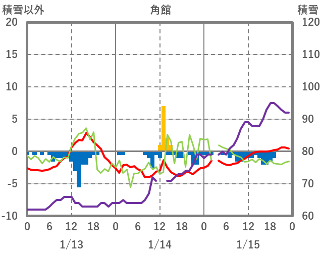 | 日 | 時 | 気温 | 降水 | 風向/風速 | 日照 | 積雪 | 降雪 |