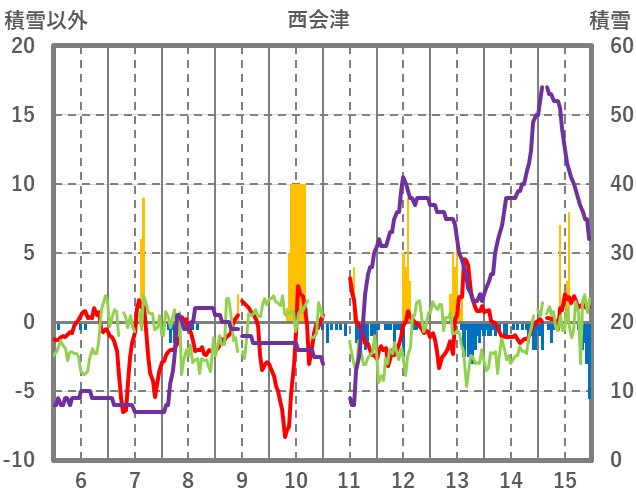 | 日 | 時 | 気温 | 降水 | 風向/風速 | 日照 | 積雪 | 降雪 |