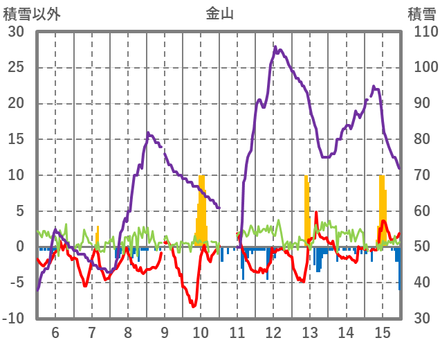 | 日 | 時 | 気温 | 降水 | 風向/風速 | 日照 | 積雪 | 降雪 |