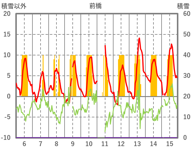 | 日 | 時 | 気温 | 降水 | 風向/風速 | 日照 | 積雪 | 降雪 |