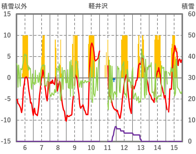 | 日 | 時 | 気温 | 降水 | 風向/風速 | 日照 | 積雪 | 降雪 |