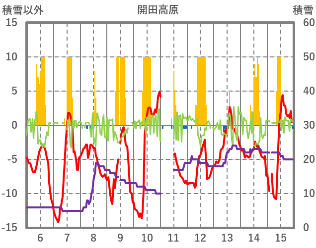 | 日 | 時 | 気温 | 降水 | 風向/風速 | 日照 | 積雪 | 降雪 |