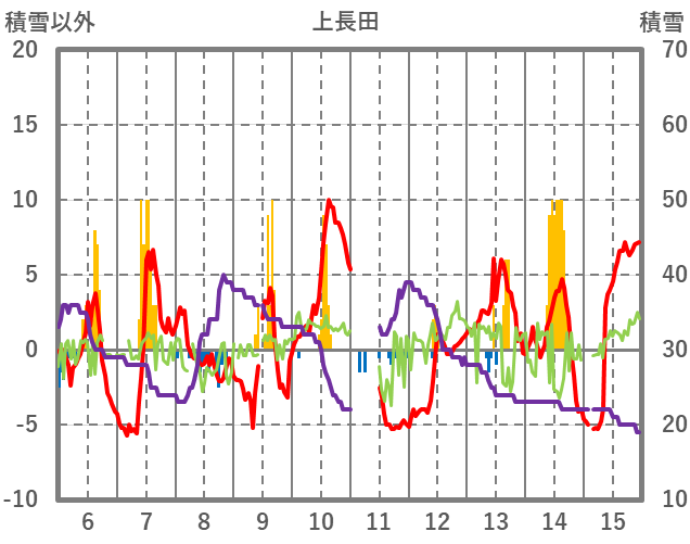 | 日 | 時 | 気温 | 降水 | 風向/風速 | 日照 | 積雪 | 降雪 |