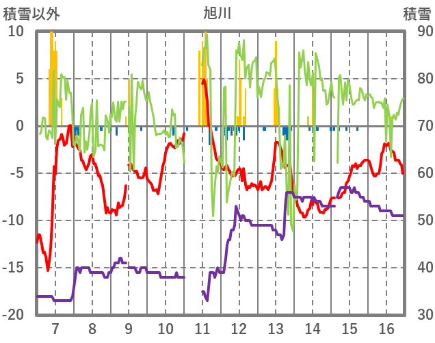 | 日 | 時 | 気温 | 降水 | 風向/風速 | 日照 | 積雪 | 降雪 |