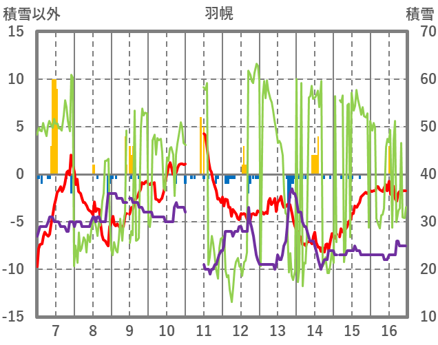 | 日 | 時 | 気温 | 降水 | 風向/風速 | 日照 | 積雪 | 降雪 |