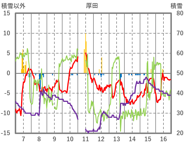| 日 | 時 | 気温 | 降水 | 風向/風速 | 日照 | 積雪 | 降雪 |