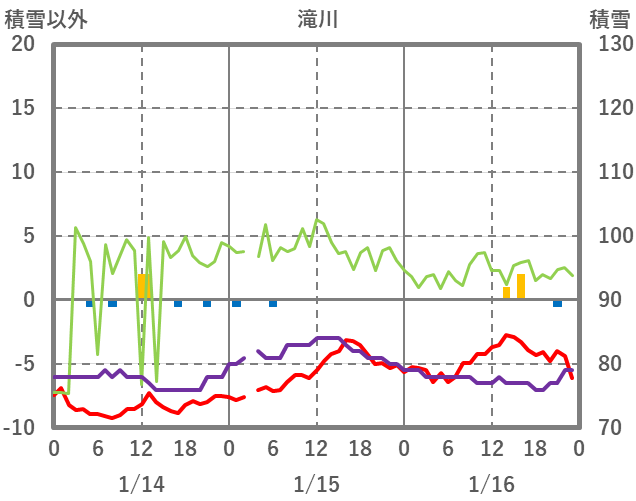 | 日 | 時 | 気温 | 降水 | 風向/風速 | 日照 | 積雪 | 降雪 |