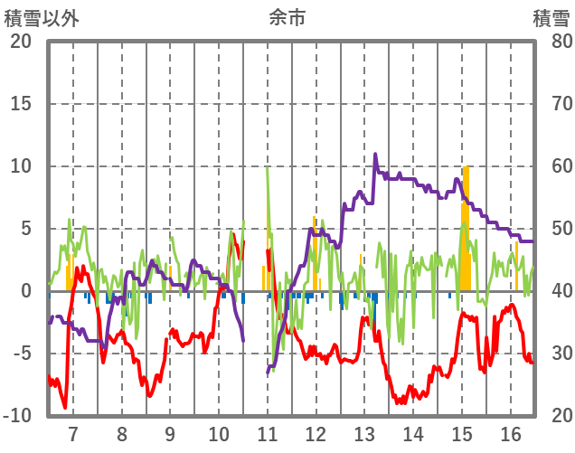 | 日 | 時 | 気温 | 降水 | 風向/風速 | 日照 | 積雪 | 降雪 |