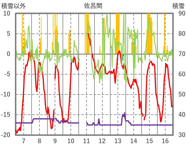 | 日 | 時 | 気温 | 降水 | 風向/風速 | 日照 | 積雪 | 降雪 |