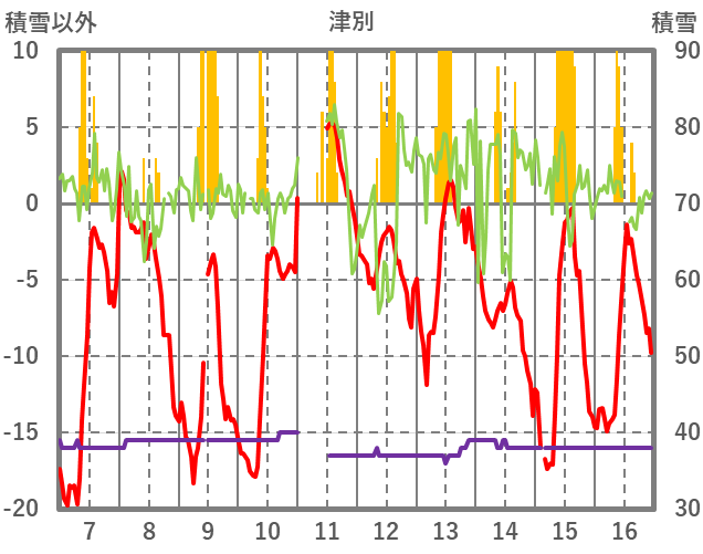 | 日 | 時 | 気温 | 降水 | 風向/風速 | 日照 | 積雪 | 降雪 |