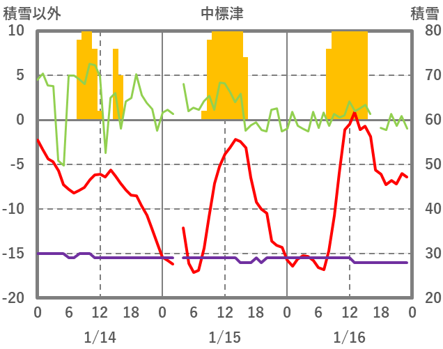 | 日 | 時 | 気温 | 降水 | 風向/風速 | 日照 | 積雪 | 降雪 |