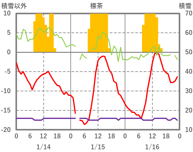 | 日 | 時 | 気温 | 降水 | 風向/風速 | 日照 | 積雪 | 降雪 |