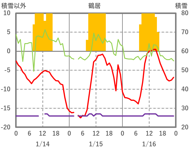 | 日 | 時 | 気温 | 降水 | 風向/風速 | 日照 | 積雪 | 降雪 |
