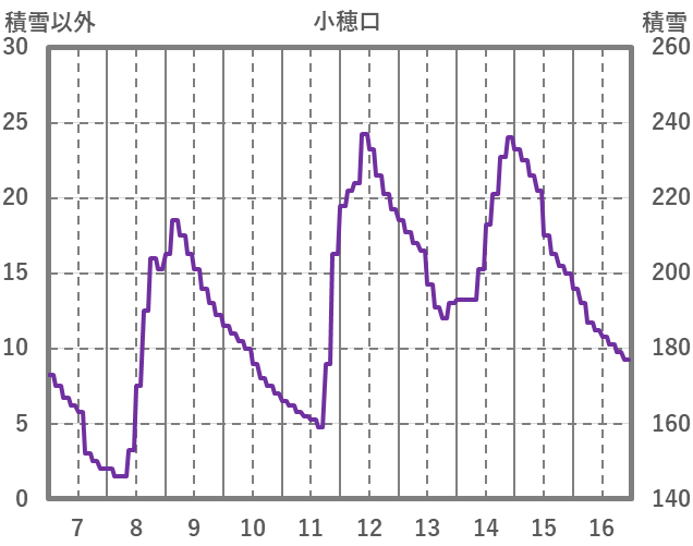 | 日 | 時 | 気温 | 降水 | 風向/風速 | 日照 | 積雪 | 降雪 |