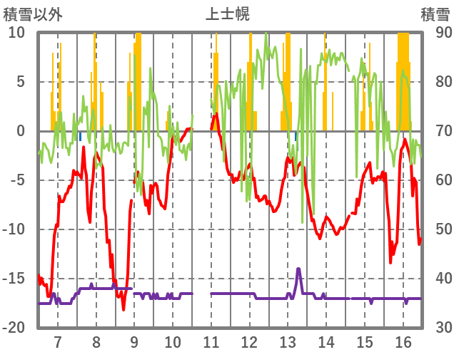 | 日 | 時 | 気温 | 降水 | 風向/風速 | 日照 | 積雪 | 降雪 |