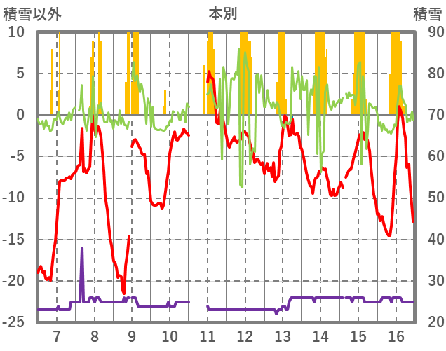 | 日 | 時 | 気温 | 降水 | 風向/風速 | 日照 | 積雪 | 降雪 |