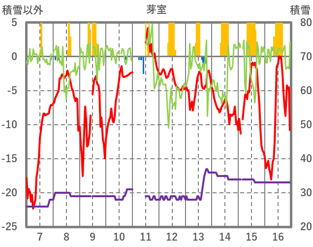 | 日 | 時 | 気温 | 降水 | 風向/風速 | 日照 | 積雪 | 降雪 |