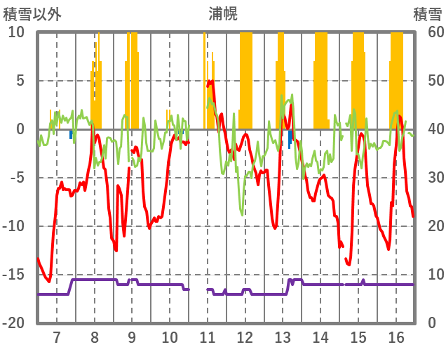 | 日 | 時 | 気温 | 降水 | 風向/風速 | 日照 | 積雪 | 降雪 |